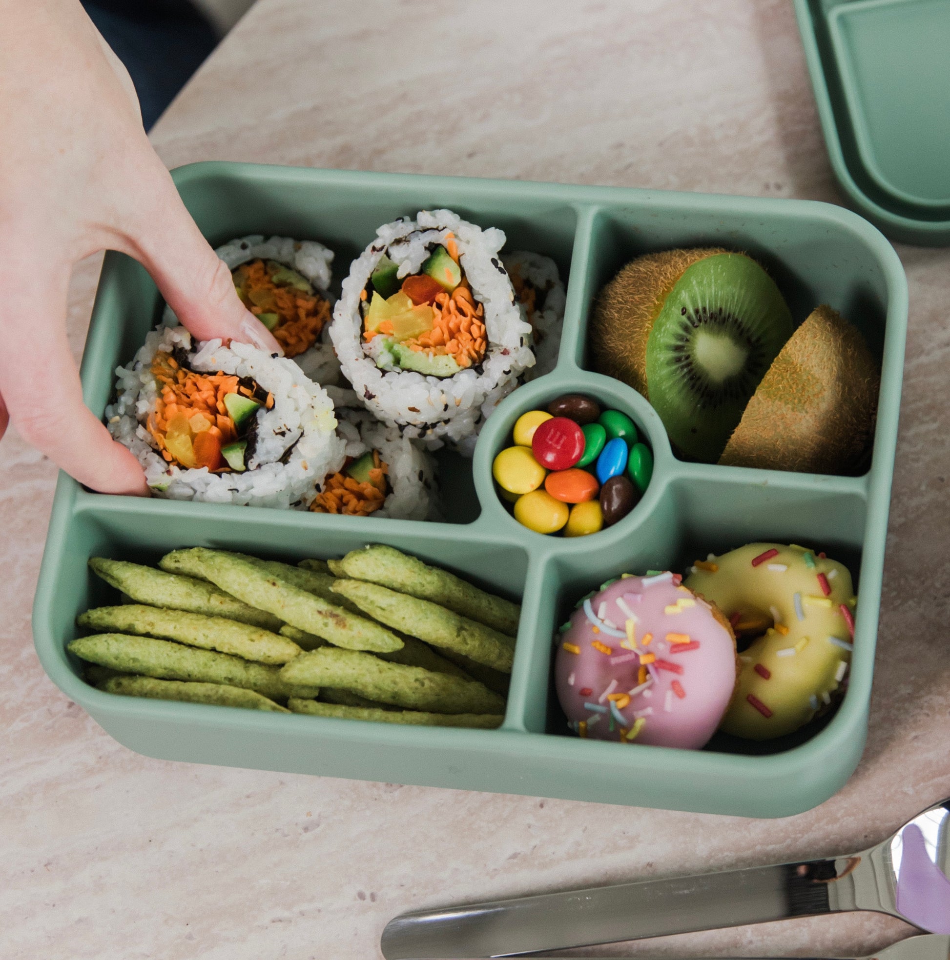 This is a Bigger sized Bento box with 5 compartments. Great for School lunches, work lunches, and picnics. Separate different foods easily with the leakproof design.